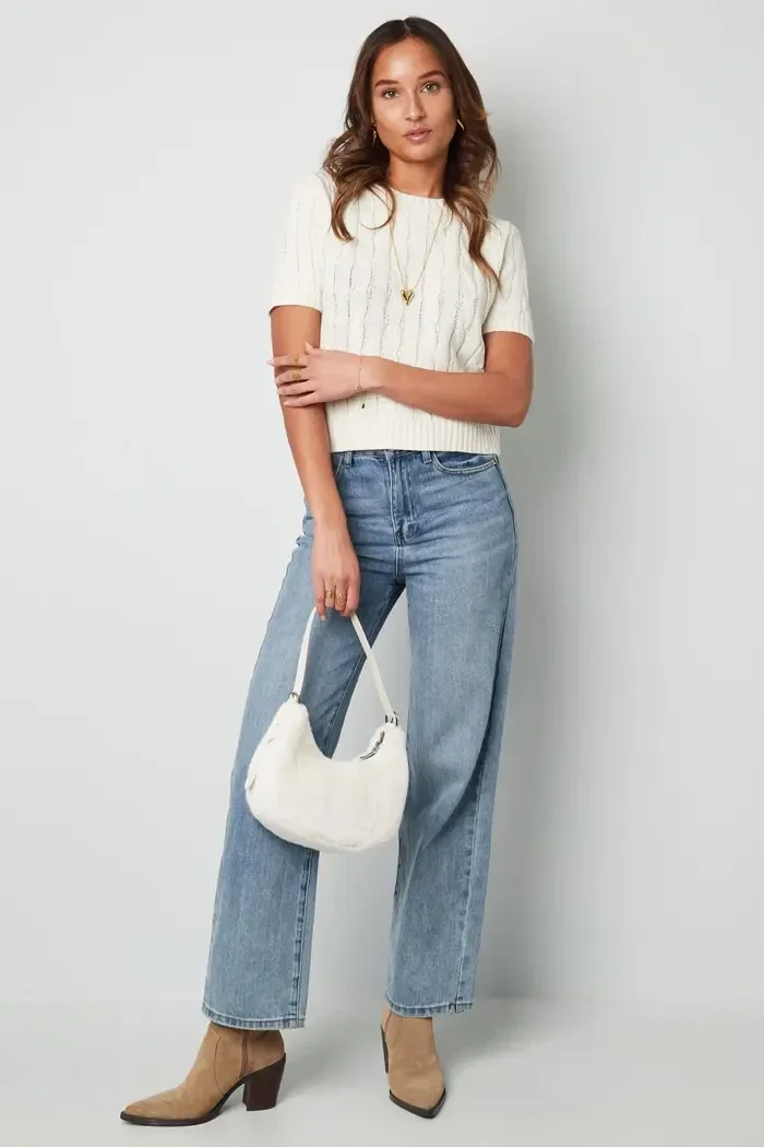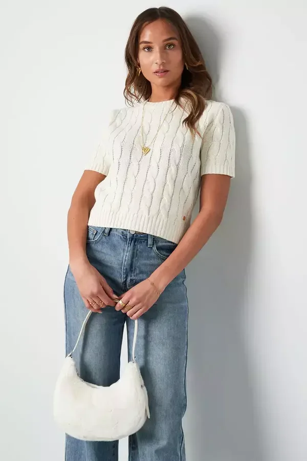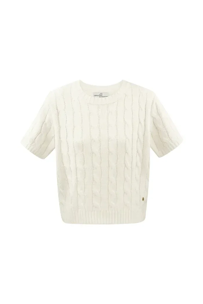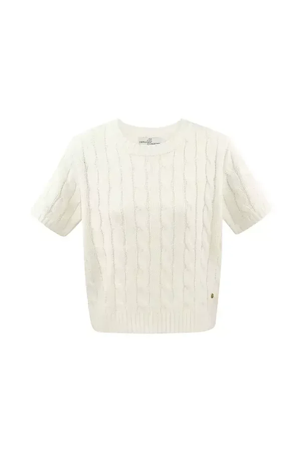 Deze klassieke gebreide trui met kabels en korte mouwen en heeft een cozy uitstraling. De trui is gemaakt van acryl.
